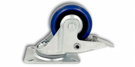 Kombinované bržděné otočné zátěžové průmyslové kolečko z galvanicky pokoveného ocelového plechu, rotační část z galvanizované oceli s modrým gumovým návlekem. Nosnost 100kg. Základna 79x105mm