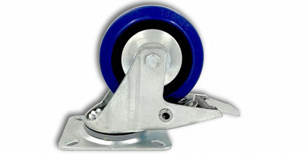 Kombinované bržděné otočné zátěžové průmyslové kolečko z galvanicky pokoveného ocelového plechu, rotační část z galvanizované oceli s modrým gumovým návlekem. Nosnost 130kg. Základna 79x105mm.