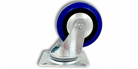Kombinované otočné zátěžové průmyslové kolečko z galvanicky pokoveného ocelového plechu, rotační část z galvanizované oceli s modrým gumovým návlekem. Nosnost 130kg. Základna 79x105mm.