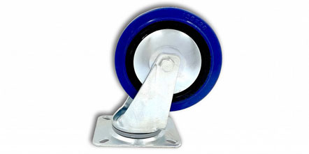Kombinované otočné zátěžové průmyslové kolečko z galvanicky pokoveného ocelového plechu, rotační část z galvanizované oceli s modrým gumovým návlekem. Nosnost 180kg. Základna 79x105mm.