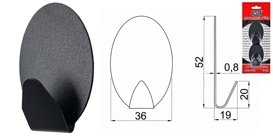 Sada 2ks ocelových, černou matnou barvou lakovaných, samolepících věšáků ESO, pro nalepení na suchý, rovný a hladký povrch v kuchyni, koupelně či jinde. Baleno po dvou kusech v blistru. Nosnost 1kg.