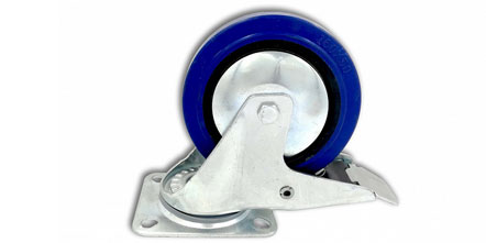 Kombinované bržděné otočné zátěžové průmyslové kolečko z galvanicky pokoveného ocelového plechu, rotační část z galvanizované oceli s modrým gumovým návlekem. Nosnost 250kg. Základna 110x133mm.