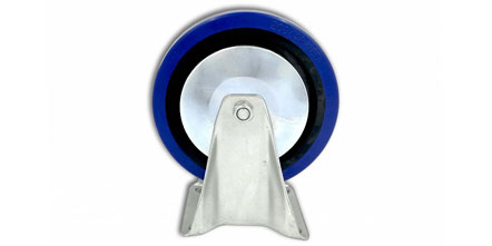 Kombinované pevné zátěžové průmyslové kolečko, třmen z galvanicky pokoveného ocelového plechu, rotační část z galvanizované oceli s modrým gumovým návlekem. Nosnost 300kg. Základna 110x135mm.
