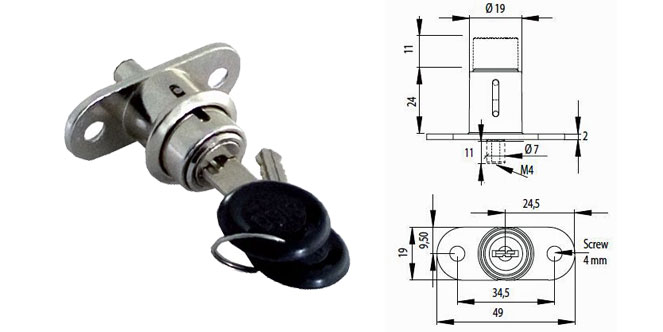 Celokovový bajonetový zámek na posuvné dveře, galvanicky pokovený, dodávaný v krabičce včetně dvou kusů cylindrických klíčků. Stejný uzávěr - více zámků se stejnými klíči.