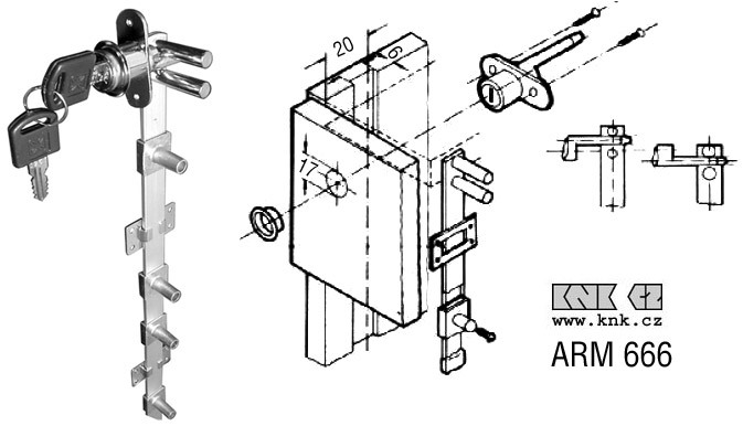 Kód produktu: 606130.03 Celokovový centrální kontejnerový zámek na čtyři zásuvky, otvíraný z čela, s táhlem délky 600mm, dodávaný včetně dvou cylindrických klíčů. Rozměry: d.600 mm