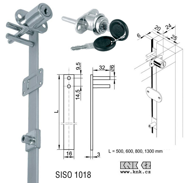 Kód produktu: 606145.03 Celokovový centrální kontejnerový zámek na čtyři zásuvky, otvíraný z čela, s táhlem délky 1300mm, dodávaný včetně dvou cylindrických klíčů. Rozměry: d.1300 mm