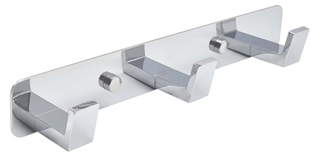 Celokovový tříháčkový šatní věšák vyrobený z galvanicky chromované oceli a hliníku, k přišroubování na stěnu, dodávaný včetně speciálních vrutů opatřených závitem v hlavičce, do kterého je šroubována krytka šroubu a hmoždinek do běžného zdiva.