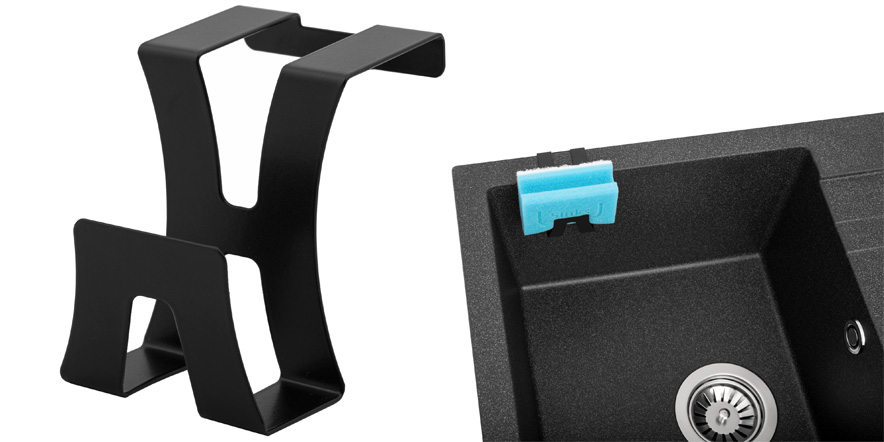 Černě lakovaný držák houbičky, vyrobený z korozivzdorného ocelového plechu, k zavěšení na hranu granitového dřezu. Rozměry: d.50 š.65 v.69 mm