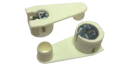 s roztečí 32mm, vyrobené z bílého plastu se Zn excentrem. Umožňuje stažení