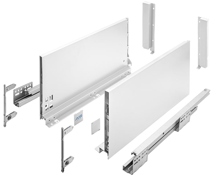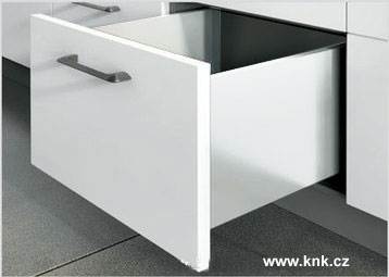 Sada pro výrobu kompletní extravysoké zásuvky (minimální světlá výška korpusu 230mm) s tenkými hranatými bočnicemi, obsahující skrytý plnovýsuv s tlumeným dovíráním, bíle lakované ocelové bočnice tl.14mm, kovové příchytky předního čela, příchytky zadního čela, záslepky otvorů pro seřízení zásuvky. Pro výrobu kompletní zásuvky je třeba doplnit pouze libovolné přední čelo zásuvky, dno a zadní čelo z materiálu tloušťky 16mm. Nosnost 40kg.