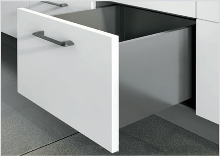 Sada pro výrobu kompletní extravysoké zásuvky (minimální světlá výška korpusu 230mm) s tenkými hranatými bočnicemi, obsahující skrytý plnovýsuv s tlumeným dovíráním, odstínem antracit lakované ocelové bočnice tl.14mm, kovové příchytky předního čela, příchytky zadního čela, záslepky otvorů pro seřízení zásuvky. Pro výrobu kompletní zásuvky je třeba doplnit pouze libovolné přední čelo zásuvky, dno a zadní čelo z materiálu tloušťky 16mm. Nosnost 40kg.