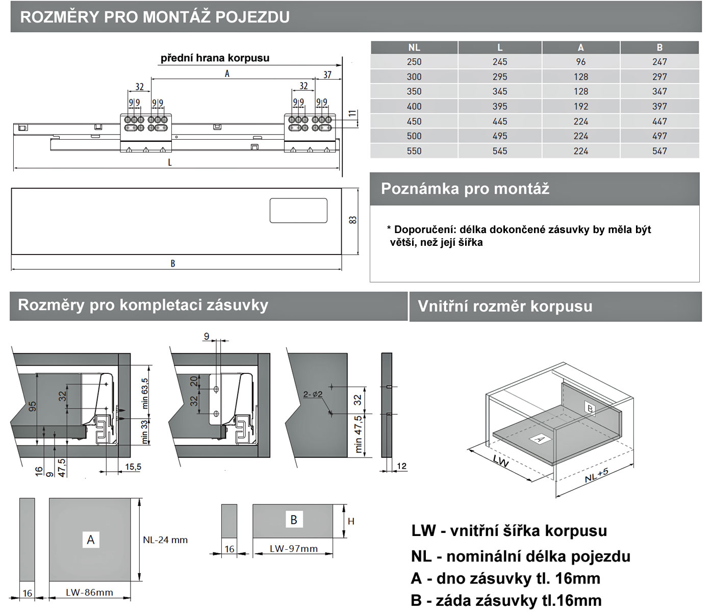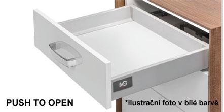 Sada pro výrobu kompletní plnovýsuvné nízké zásuvky se systémem PUSH-TO-OPEN (otvíraná zatlačením) s šedě lakovanými bočnicemi, obsahující skrytý plnovýsuv, kovové příchytky předního čela, příchytky zadního čela, záslepky otvorů pro seřízení zásuvky. Pro výrobu kompletní zásuvky je třeba doplnit pouze libovolné přední čelo zásuvky, dno a zadní čelo z materiálu tloušťky 16mm. Nosnost 40kg.