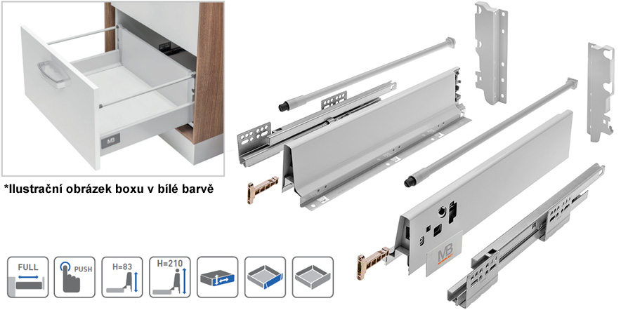 Sada pro výrobu kompletní plnovýsuvné vysoké zásuvky se systémem PUSH-TO-OPEN (otvíraná zatlačením) s šedě lakovanými bočnicemi obsahující skrytý plnovýsuv, , jedním párem podélného relingu, kovovými příchytkami předního čela, příchytkami zadního čela, záslepkami otvorů pro seřízení zásuvky. Pro výrobu kompletní zásuvky je třeba doplnit pouze libovolné přední čelo zásuvky, dno a zadní čelo z materiálu tloušťky 16mm. Nosnost 40kg. Zboží není určeno pro velkoobchodní prodej - není možné poskytnout slevu.