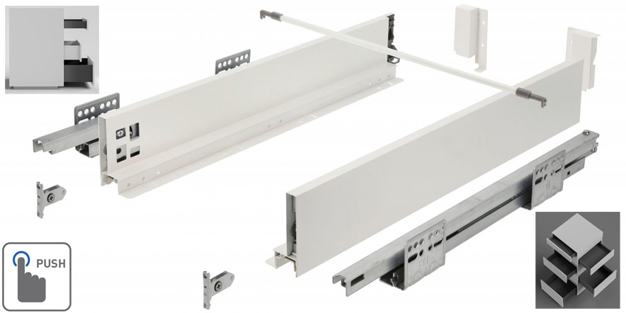 PUSH TO OPEN sada pro výrobu kompletní bezúchytkové nízké zásuvky (minimální světlá výška korpusu 115mm) s tenkými hranatými bočnicemi, obsahující skrytý plnovýsuv s mechanismem pro povysunutí zásuvky zatlačením na čílko, bíle lakované ocelové bočnice tl.14mm, kovové příchytky předního čela, příchytky zadního čela, záslepky otvorů pro seřízení zásuvky. Synchronizační tyč AX-SYNCHRO.35 není součástí setu, v případě potřeby a výroby širší zásuvky je třeba ji zakoupit zvlášť.