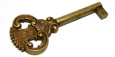 Kód produktu: E231G4.52 Celokovový ozdobný klíč z galvanicky pokovené slitiny zinku, s plným praporkem, pro vypilování tvaru dle zámku. Rozměry: d.74 š.6 v.33