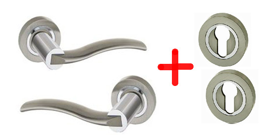 Komplet celokovová dělená klika s krytou rozetou, vyrobená ze slitiny zinku, galvanicky pokovená lesklým chromem a broušeným niklem, dodávaná včetně kulatých rozet 100 pro cylindrický klíč (FAB), čtyřhranu a šroubů balených v kartonové krabičce. Kryté spojovací šrouby z jedné poloviny skrz průchozí díry šroubované do vnitřních závitů v rozetách protějších na rozetách u kliky i zámku, demontovatelné pouze z jedné strany, následně překryté na vnitřní části našroubovaným vnějším dílem rozety.