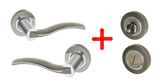Komplet celokovová dělená klika s krytou rozetou, vyrobená ze slitiny zinku, galvanicky pokovená lesklým chromem a broušeným niklem, dodávaná včetně kulatých rozet 100 pro WC zámek (z jedné strany ovládaný otočným prvkem, z druhé, v případě nouze možnost odemčení pomocí šroubováku), čtyřhranu a šroubů balených v kartonové krabičce. Kryté spojovací šrouby z jedné poloviny skrz průchozí díry šroubované do vnitřních závitů v rozetách protějších na rozetách u kliky i zámku, demontovatelné pouze z jedné strany, následně překryté na vnitřní části našroubovaným vnějším dílem rozety.