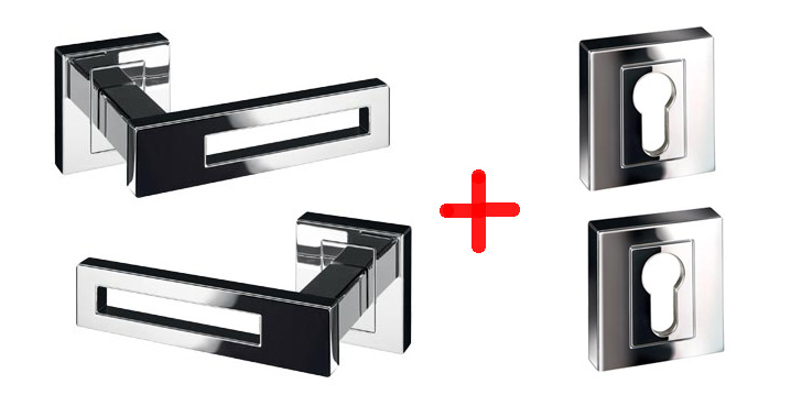 Komplet celokovová dělená klika s krytou rozetou, vyrobená ze slitiny zinku, galvanicky pokovená, dodávaná včetně čtvercových rozet 121 pro cylindrický zámek (FAB), čtyřhranu a šroubů balených v kartonové krabičce. Kryté spojovací šrouby z jedné poloviny skrz průchozí díry šroubované do vnitřních závitů v rozetách protějších na rozetách u kliky i zámku, demontovatelné pouze z jedné strany, následně překryté nasazeným a červíkem dotaženým vnějším dílem rozety.