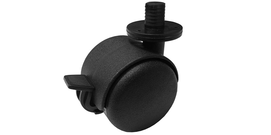 Celoplastové bržděné dvojkolečko typu BA pr.50mm pro nábytková uchycení, dodávané v kompletu s uchycením čepem ve větším plastovém pouzdru pr.12,3x14mm.