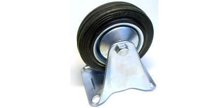 Kód produktu: 514100 1.14 Kombinované pevné kolečko z galvanicky pokoveného ocelového plechu, rotační část z galvanizované oceli s černým gumovým návlekem. Nosnost 60kg Základna 90x102mm Rozměry: d.102 š.90 v.130 mm
