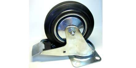 Kód produktu: 514200 3.14 Kombinované bržděné kolečko z galvanicky pokoveného ocelového plechu, rotační část z galvanizované oceli s černým gumovým návlekem.Nosnost 140kg Základna 110x135mm Rozměry: d.240 š.110 v.235 mm