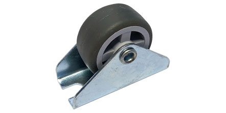 Kombinované pevné kolečko, třmen z galvanicky pokoveného ocelového plechu, rotační část z šedého plastu s měkčenou PU obručí. Základna 45x19x1,2mm s otvorem pr.5 a drážkou š.6mm, rozteč 35mm. Nosnost 25kg.