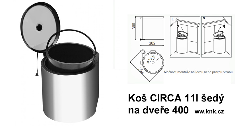 Závěsný - výklopný odpadkový koš z nerezové oceli a plastu k montáži na stěnu korpusu a vnitřní stěnu dvířek, při jejichž otevření se víko koše vyklápí, dodávaný včetně montážní sady a vyjímatelné vložky objemu 11l. Možnost montáže na pravé i levé dveře. Pro skříňky o šířce minimálně 400mm. Širší skříňku je možno doplnit například výsuvným košem.