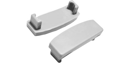 Sada 2ks dekorativních šedých plastových koncovek-záslepek k zakončení naložené hliníkové lišty pro instalaci osvětlovacího LED pásku na povrch korpusu. Montáž - nasunutím z boku naložené hliníkové lišty v místě řezu.