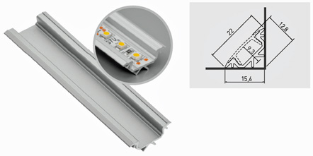 Hliníková eloxovaná lišta, k montáži mezi dvě desky svírajíc pravý úhel, nejčastěji horní skříňku kuchyňské linky a stěnu za linkou, pro výrobu osvětlení a chlazení LED pásku do šířky 10mm 20W/m, dodávaná bez krytky. Montáž - po uříznutí na potřebnou délku, nalepením či přišroubováním skrz předem připravené otvory do rohu mezi dvě desky.