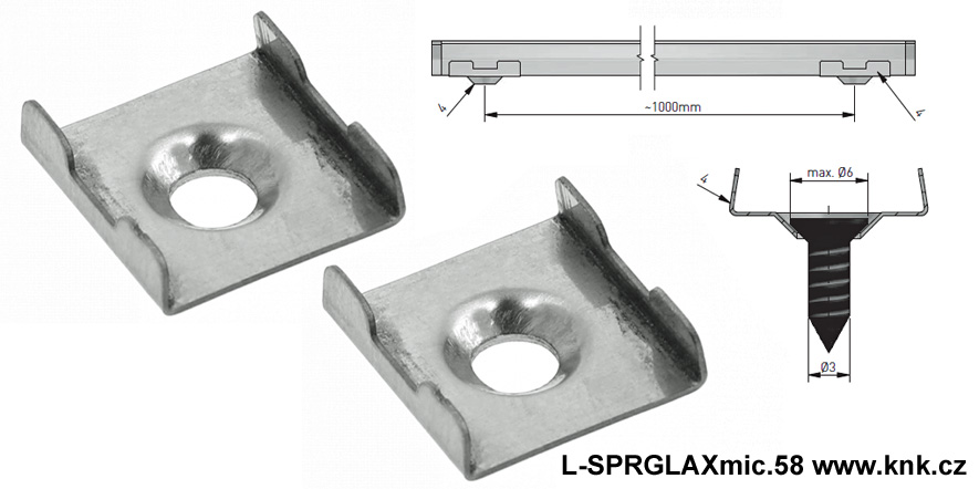 Pár (2ks) tvářených nerezových plechových příchytek pro přišroubování k povrchu (ideálně vruty pr.3mm se zápustnou hlavou max.průměru 6mm) a připevnění (nacvaknutím) AL MINI lišty pro LED pásku do šířky 10mm.