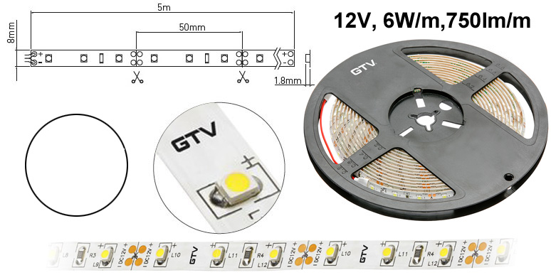 750lm/m, 120_ barva denní bílá 4000K, dělitelný po 50mm. Cca 13cm přívod.