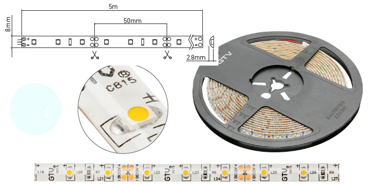 Pmax=4,8W/m, 280lm/m, 120° barva studená bílá 6500K, dělitelný po 50mm.
