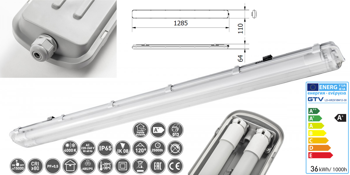 LED prachotěsné svítidlo pro vnitřní i vnější použití, kategorie A+ pro AC220-240V, dodávaná včetně dvou 18W LED zářivek délky 1200mm s paticí G13, svítivostí 1800lm/ks a denní barvou světla 4000K. Stupeň krytí IP65, Ochranná třída 2, CRI>80