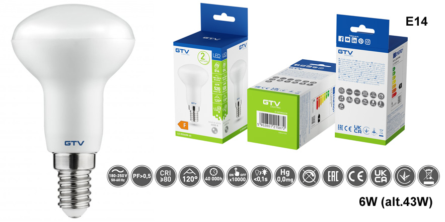 LED žárovka (SPOT- bodová), světelný zdroj 6W denní bílá (4000K), 520lm (náhrada cca 43W klasické žárovky do patice E14 s malým závitem - mignon), nestmívatelná. 180-250V 50-60Hz, PF>0,5, úhel svitu 120°, čipy SMD2385, životnost 40000h, sepnutí 10000x, CRI>80, start<0,1s.