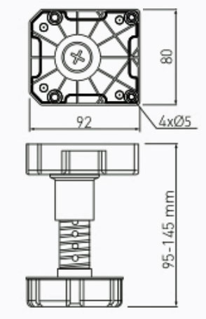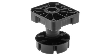 Celoplastová třídílná zátěžová soklová kuchyňská noha z černého plastu, používaná pro ustavení nábytku, stavitelná, bez klipu na sokl. Nosnost 450kg!