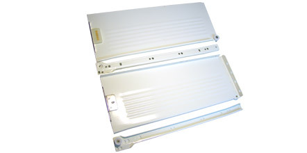 Klasický kolečkový částečný výsuv povrchově upravený komaxitováním, dodávaný v sadě 4 dílů včetně plechových bočnic na jednu zásuvku. Vzdálenost mezi bočnicí zásuvky a vnitřní stranou korpusu je standardních 12mm