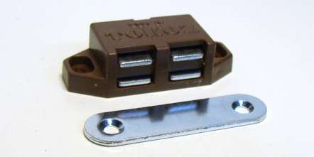 Kód produktu: 51002011.14 Magnetická sklapka z feritových magnetů, ocelových pólových nástavců a skříňky z plastu, určená k fixaci nábytkových dveří v zavřené poloze, dodávaná včetně protiplechu. Rozměry: d.52 š.20 v.14 mm