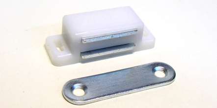 Malá magnetická sklapka se skříňkou z bílého plastu, určená k fixaci nábytkových dveří v zavřené poloze pomocí magnetu, dodávaná včetně protiplechu.