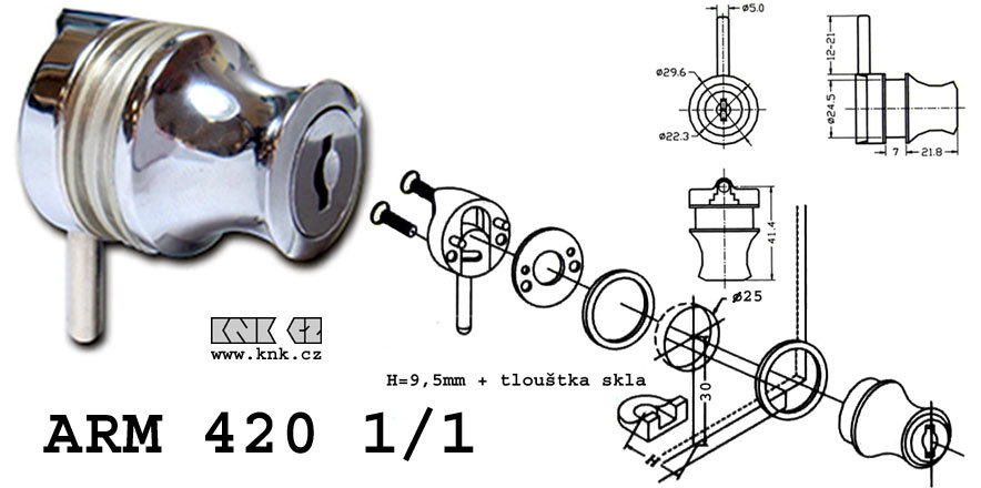 Kód produktu: 54250.03 Celokovový zámek na jednokřídlá skleněná dvířka do díry pr.25, galvanicky pokovený, dodávaný včetně dvou cylindrických klíčů a zarážky. Rozměry: d.42 š.29 v.41 mm