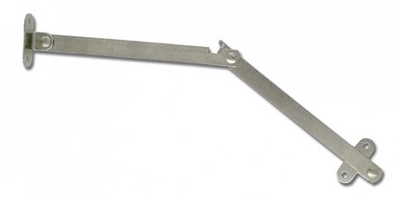 Ocelová nýtovaná rozpěra pro nahoru vyklápěcí dveře se zajištěním v otevřené poloze Zpětné odjištění se provede nadzvednutím dveří a ručním odjištěním, zatlačením do středu podpěry. Průměr otvorů na uchycení 3mm