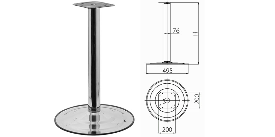 Ocelová chromovaná centrální noha k barovému stolku v.735mm, s průměrem základny 495mm, sloupem pr. 76mm a čtvercovou upevňovací deskou o rozměrech 200x200mm.