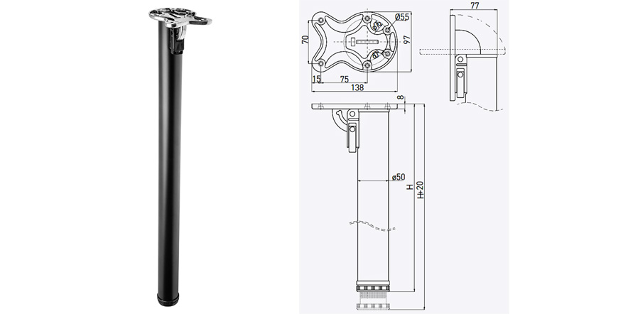 Sklopná válcová stolová noha vyrobená z galvanicky pokovené či lakované oceli, se spodní rektifikací (0,+20mm) a sklopnou hliníkovou přírubou, používaná pro výrobu obytných vestaveb do aut či dočasně používaných, skladovatelných stolů. Výška nohy po sklopení 77mm. Výšková regulace +0 - +20mm