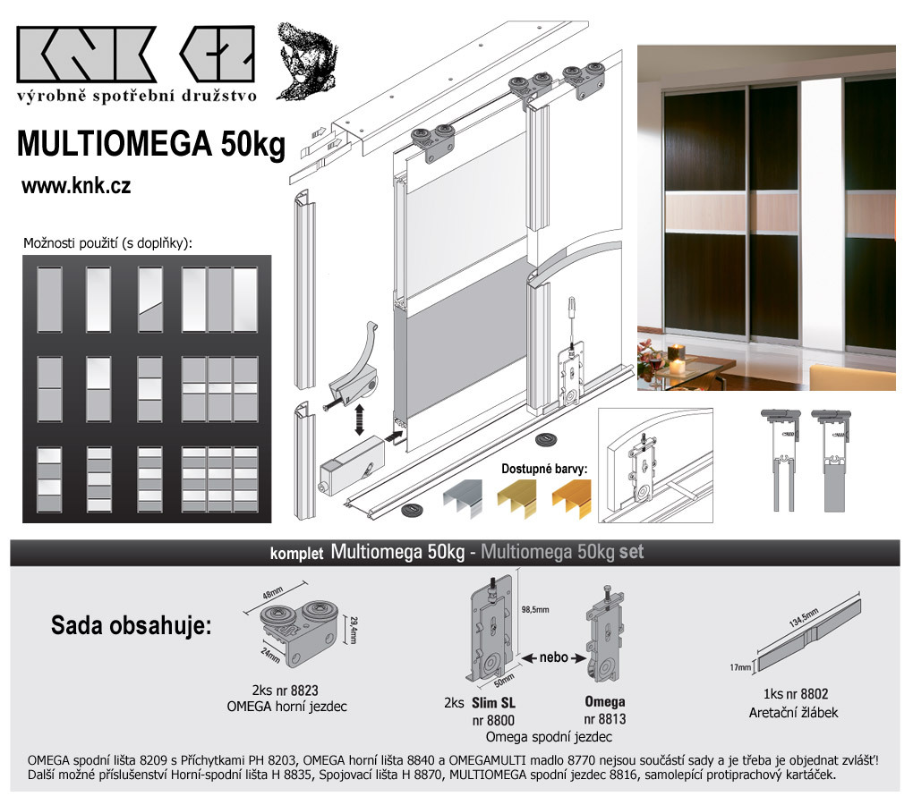Sada kování pro jedny posuvné dveře do hmotnosti 50kg, dodávaná v sadě, bez spojovacího materiálu. Sada obsahuje 2x horní kovový, 2x spodní jezdec, 1x aretační žlábek(pozicioner). Horní, spodní vodící lišty, jejich příchytky, úchytková madla ani profily nejsou součástí sady.