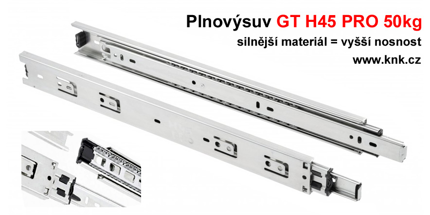 Kuličkový plnovýsuv pro vyšší zatížení, povrchově upravený zinkováním, na bok zásuvky, pro její úplné vysunutí, v sadě dvou kusů na jednu zásuvku. Nosnost 50kg. Beznářaďová možnost úplného vysazení namontované zásuvky, po stlačení západek, mezi díly vysunutého plnovýsuvu.
