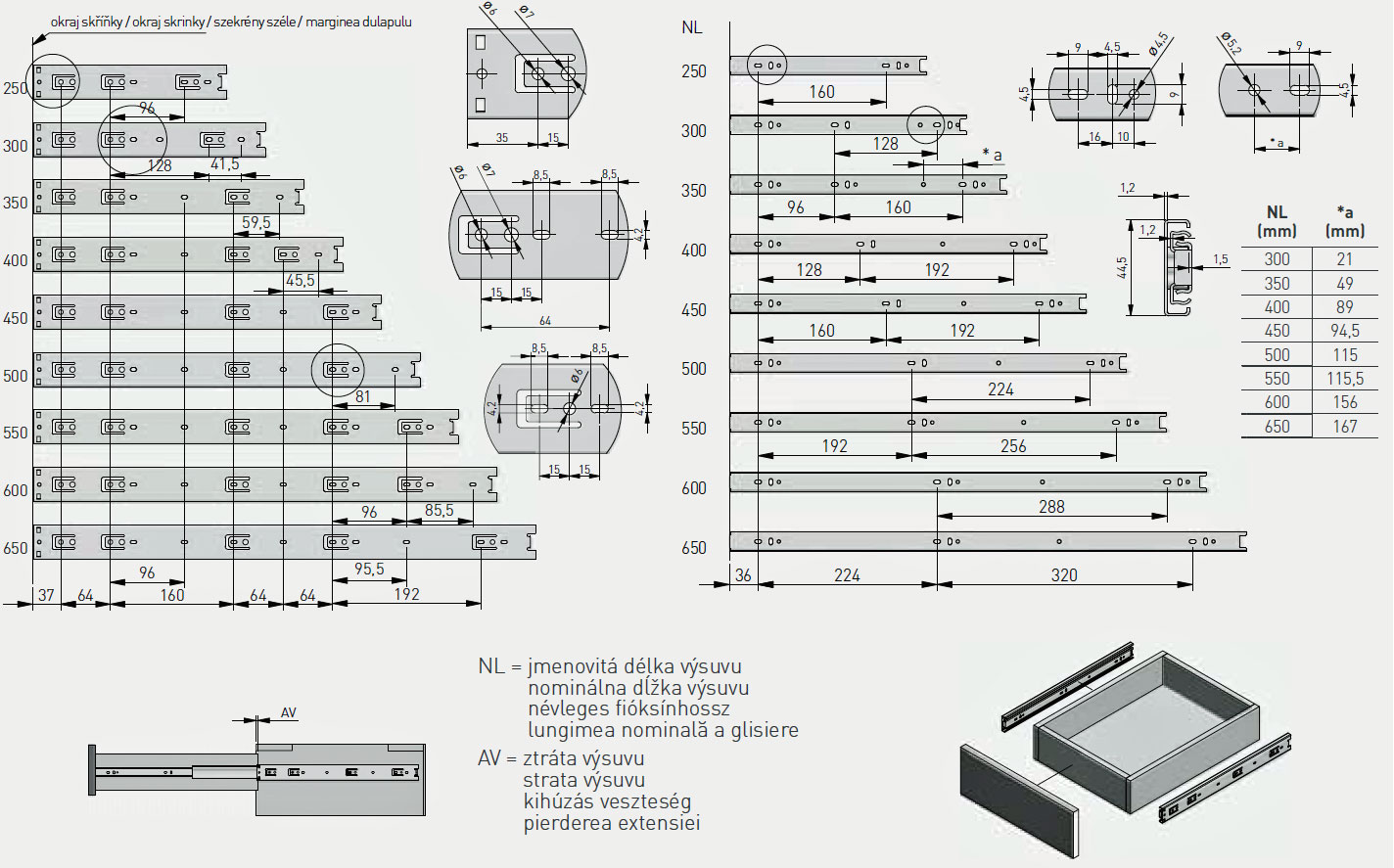 Rozměry: d.500 š.12,7 v.45mm ztráta výsuvu d.300-750mm = 0mm