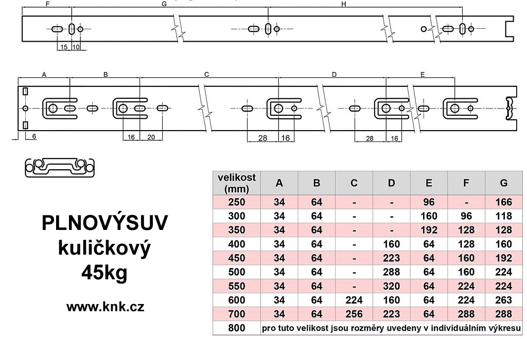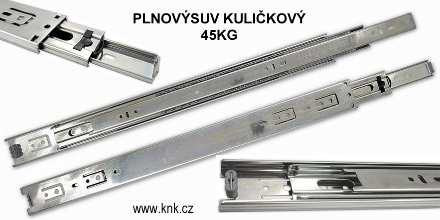 Kuličkový plnovýsuv povrchově upravený zinkováním, na bok zásuvky, pro její úplné vysunutí, v sadě dvou kusů na jednu zásuvku. Nosnost 45kg. Samozřejmostí tohoto plnovýsuvu je možnost úplného vysazení zabudované zásuvky, vysunutím po stlačení západek na vnější straně vnitřního dílu plnovýsuvu. Nosnost 45kg. Spojovací materiál - vrut pr.3,5x16mm, není součástí dodávky, ale je možno je dokoupit zvlášť.