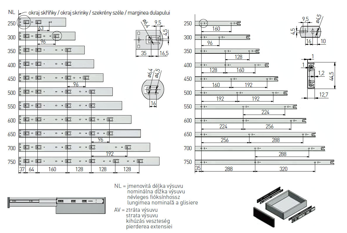 Univerzální, certifikované kuličkové ložisko H45 PRESTIGE se samozavíracím pouzdrem umožňuje konstrukci standardních a vnitřních zásuvek. Hodí se pro všechny typy zásuvek - úzké, široké, kuchyňské, kancelářské i dílenské. Je třeba mít na paměti, že pro správnou funkci zásuvky by její šířka neměla překročit jmenovitou délku plnovýsuvu. H45 PRESTIGE je k dispozici v mnoha délkách: 250, 300, 350, 400, 450, 500, 550, 600, 650, 700 mm.