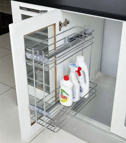 Dvojitý ocelový plnovýsuvný košík do úzké skříňky 200mm, povrchově upravený galvanickým chromováním, na tlumených plnovýsuvech BLUM - levé provedení, přepážky na spodním koši.