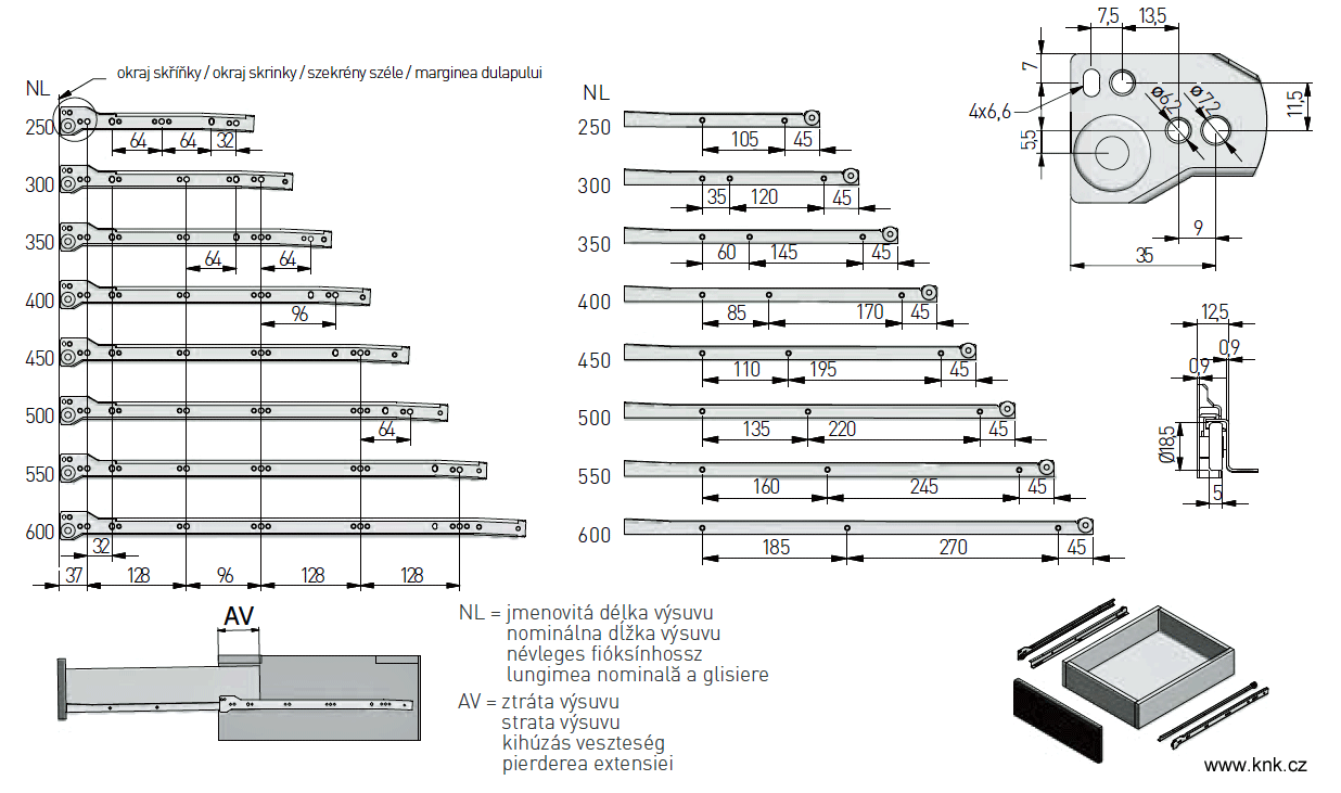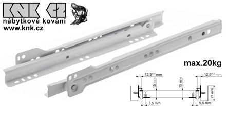 Ekonomická varianta klasického kolečkový částečného (délka vysunutí zásuvky je vždy kratší než nominální délka pojezdu o tzv. ztrátu vysunutí) výsuvu povrchově upraveného bílým komaxitem, dodávaného v sadě 4 dílů na jednu zásuvku. Zástavná šířka 12,5mm, tzn. světlá šířka korpusu musí být o 25mm větší, než je vnější šířka zásuvky. Vruty 3,5x16mm nejsou součástí dodávky, ovšem je možno je zakoupit zvlášť.