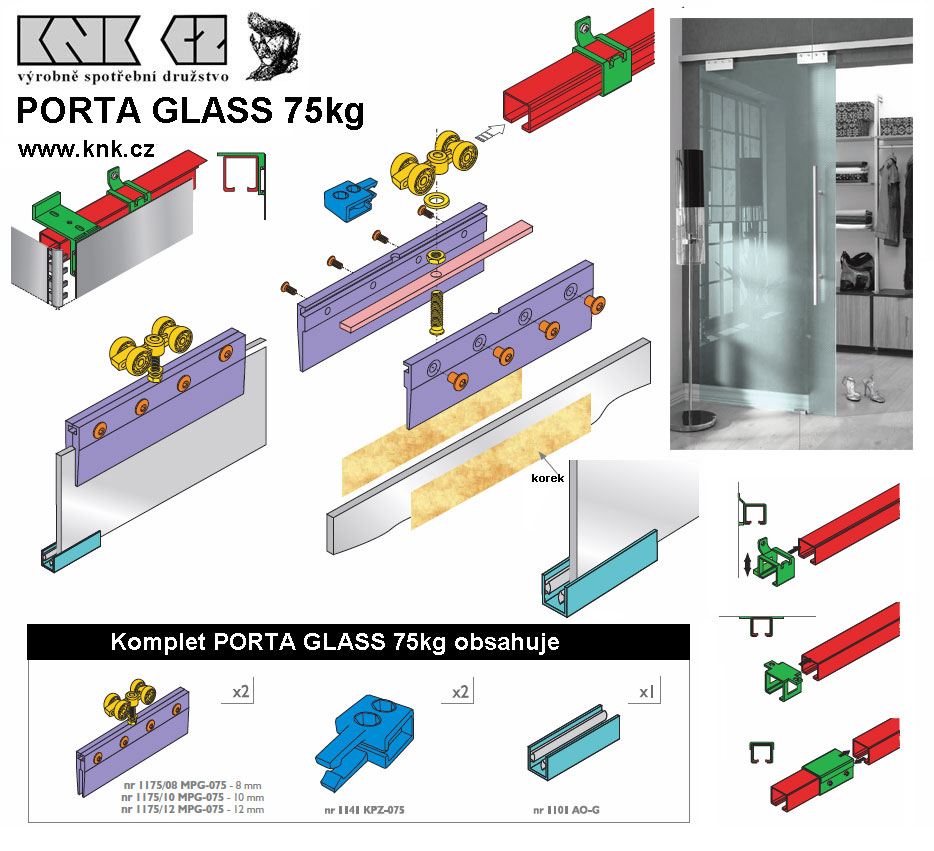 Sada kování pro jedny posuvné skleněné dveře tl.8 do 75kg, dodávaná v sadě